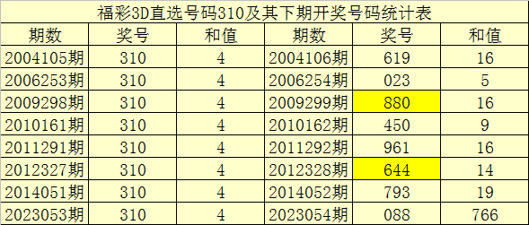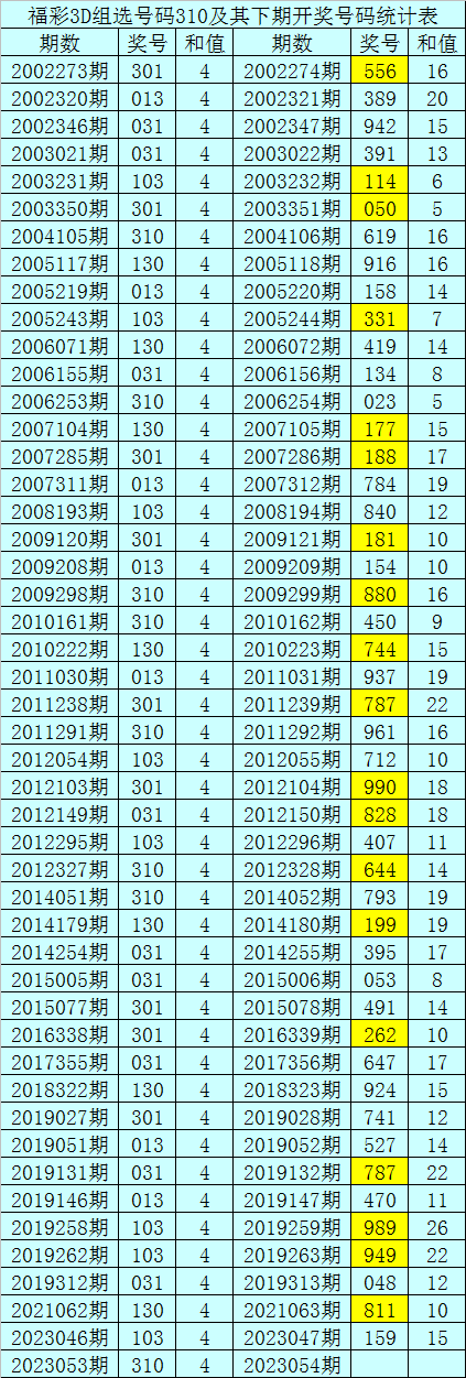 二、组选分析:历史上组选号码310开出了48次,其下期奖号差异为:556-389-942-391-114-050-619-916-158-331-419-134-023-177-188-784-840-181-154-880-450-744-937-787-961-712-990-828-407-644-793-199-395-053-491-262-647-924-741-527-787-470-989-949-048-811-159,其开出期数和下期奖号统计为: