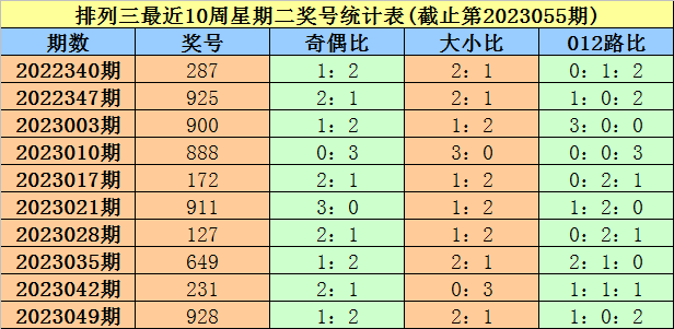 陈设三第2023049期(上周星期二)奖号为928。其中奖号奇偶比为1:2,大小比为2:1,012路比为1:0:2。